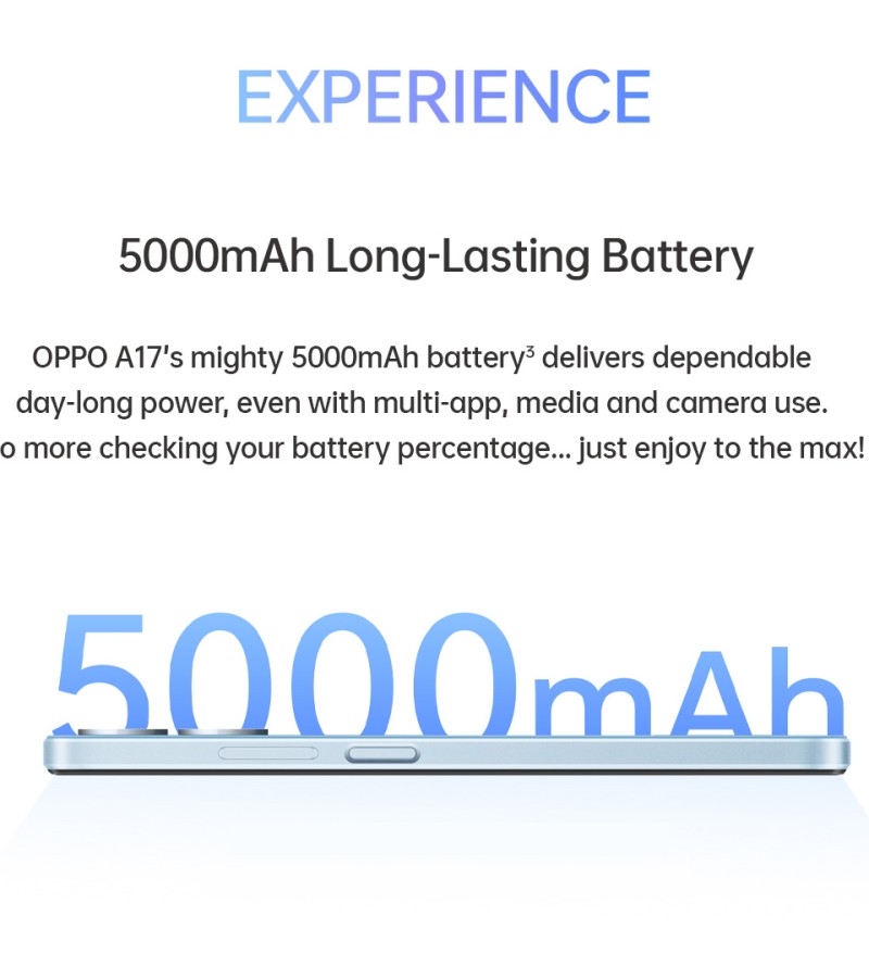 The OPPO A17 is equipped with 5000mAh long-lasting batteries combined with smart charging and